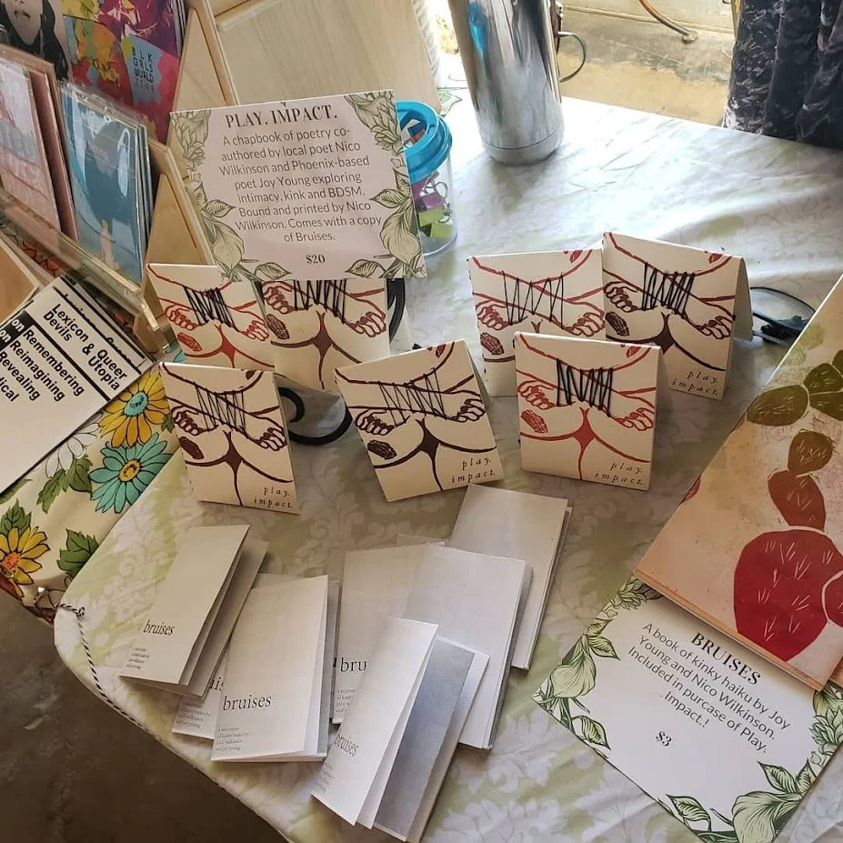 Prickly Pear Printing is/was an endeavor founded by storyteller Joy Young, photographer and disability rights activist Briana Noonan, and myself to publish LGBTQ+ poets and artists, with an emphasis on sharing the love, joy, and growth that permeates every queer person’s journey. We utilized both digital and letterpress printing techniques, and all books were bound in-house using a perfect binding machine.